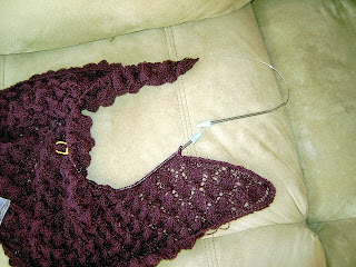 I have begun knitting off the top edge of the bamboo shawl. There's no pattern for this; I just found a leafy lace pattern, started at the bottom and increased up to the top, making a 3-stitch garter on the edges. Now, I'm knitting off the top with a 3-stitch garter edge so it'll be as stretchy as the rest. Oh, and I figured out how to knit those 3 stitches backwards, so no turning. It's still a little awkward, but certainly faster that all that flipping around.